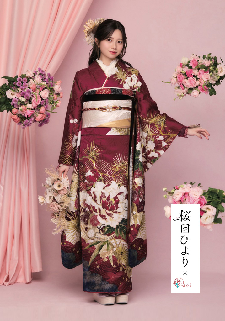 深みのある赤地に牡丹や松文様があしらわれ、華やかさと格式を兼ね備えた一着。