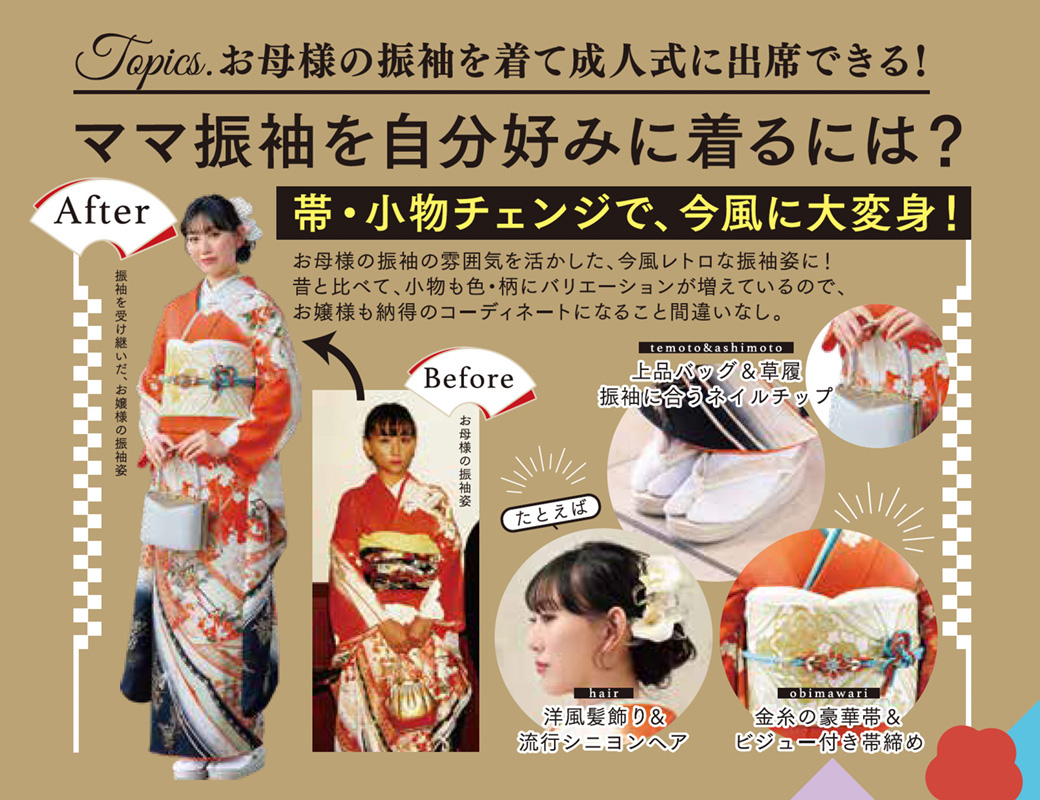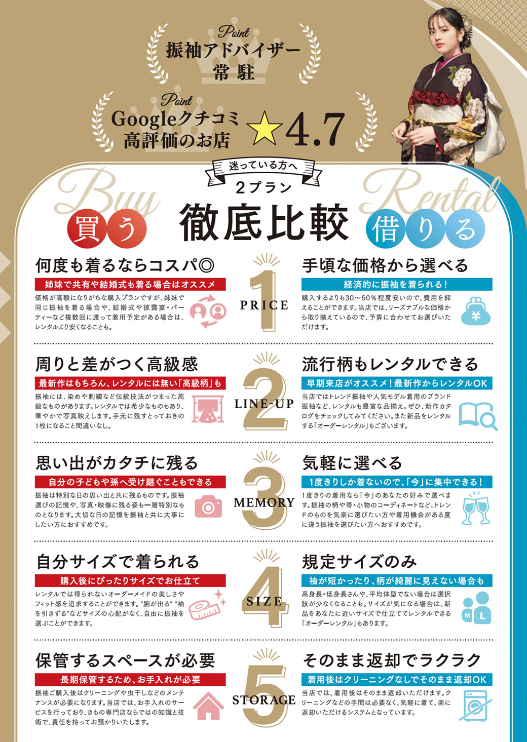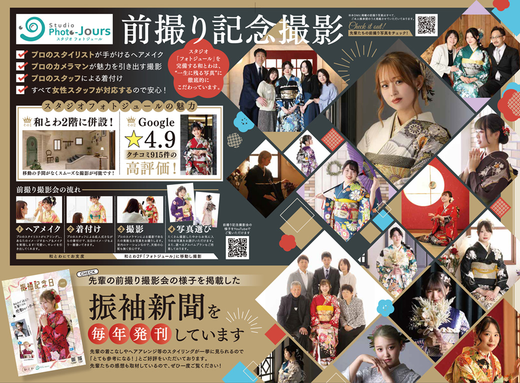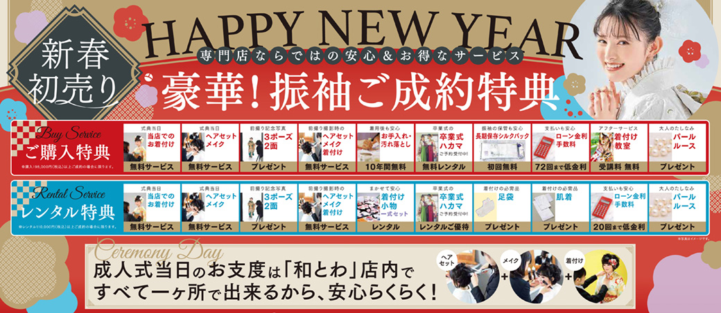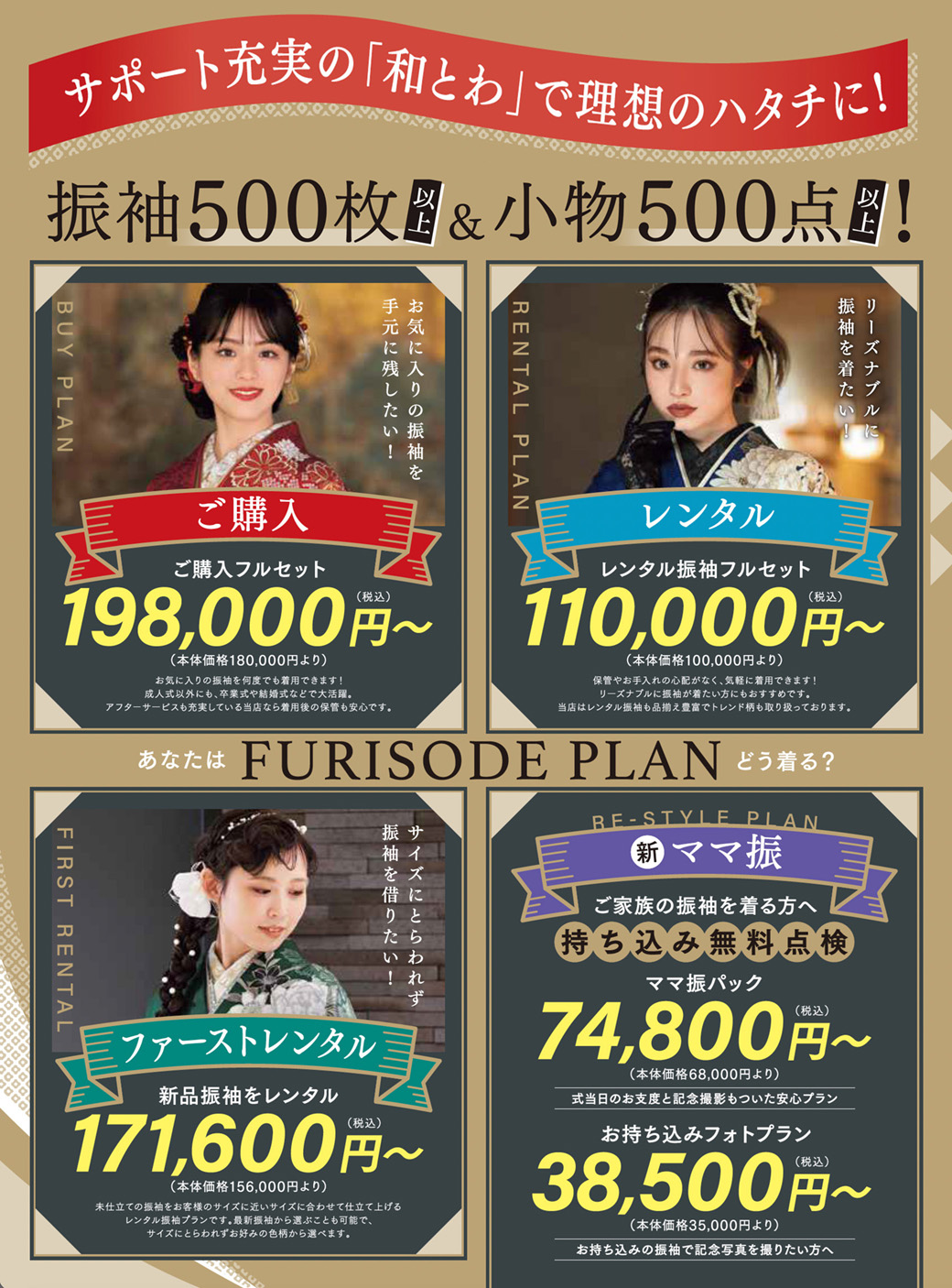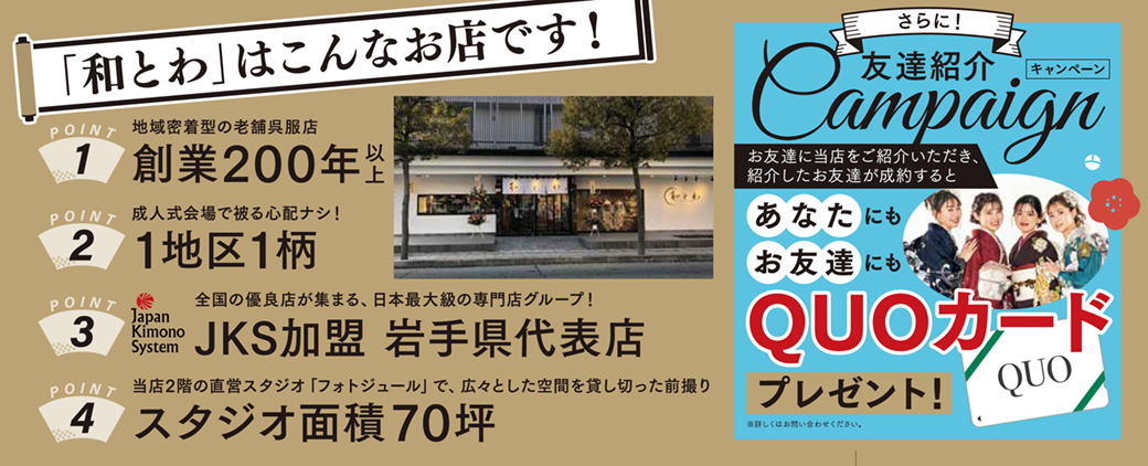 「和のある豊かな人生を永遠に応援し続けます」をモットーに、振袖地域1番店を目指し、お振袖選びから、前撮り撮影、家族成人式、成人式当日のお支度、卒業袴のレンタル、アフターケアなどのすべてのサポートを承っております。